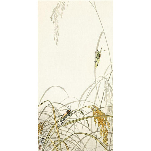 Grasshoppers on rice plants Black Modern Wood Framed Art Print by Koson, Ohara