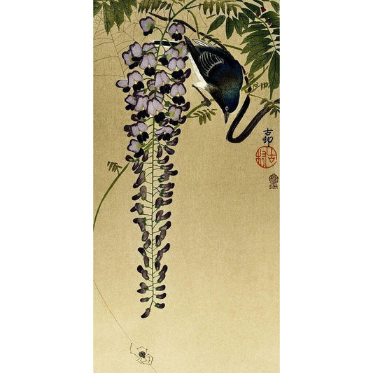 Flycatcher at wisteria Black Modern Wood Framed Art Print by Koson, Ohara