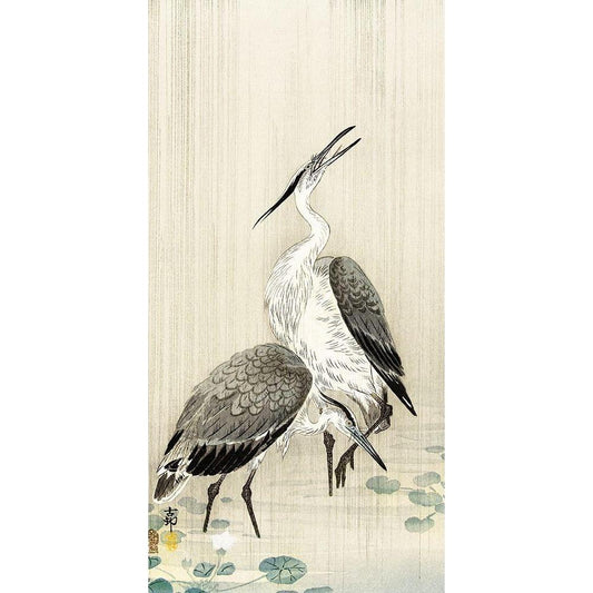 Two herons in the rain Black Modern Wood Framed Art Print by Koson, Ohara