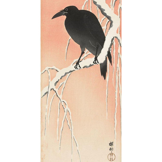 Crow on snowy branch Black Modern Wood Framed Art Print by Koson, Ohara
