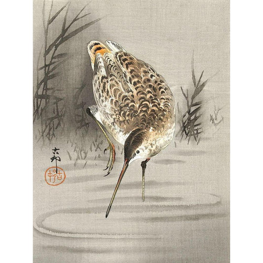 Snipe in the water Black Modern Wood Framed Art Print by Koson, Ohara