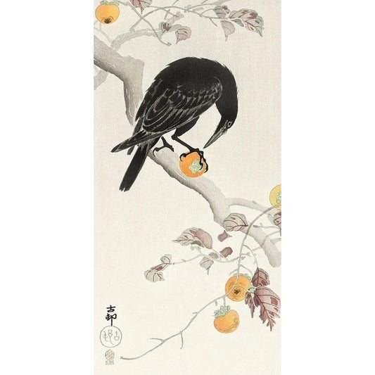 Crow with kaki fruit Black Modern Wood Framed Art Print by Koson, Ohara
