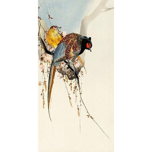 Pheasant couple and plum blossom Black Modern Wood Framed Art Print by Koson, Ohara