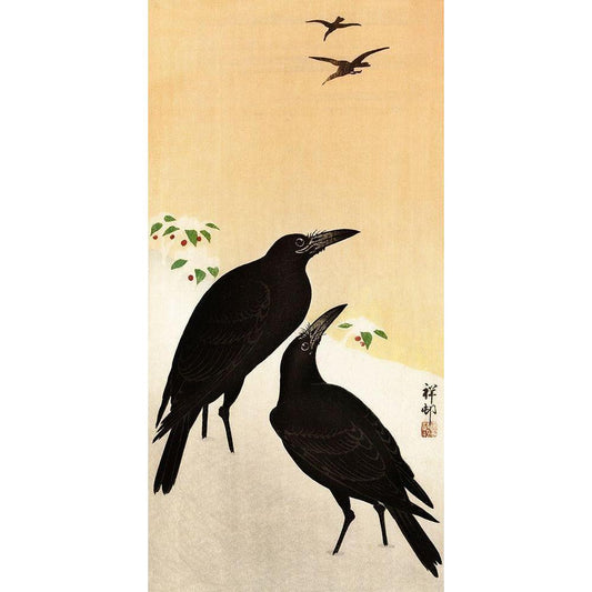 Crows in snow Black Modern Wood Framed Art Print by Koson, Ohara