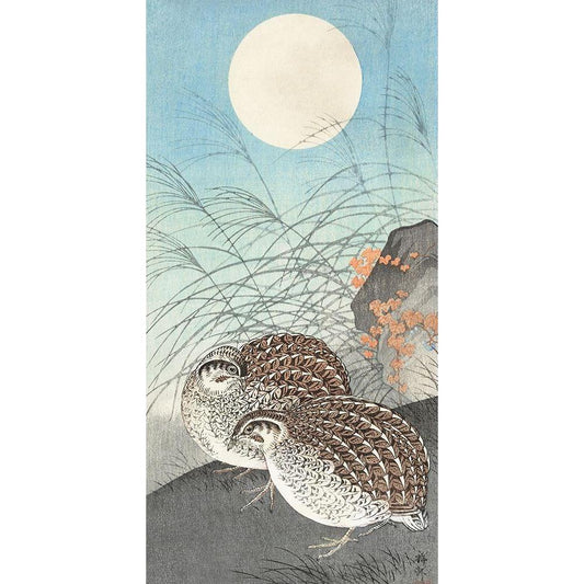 Two quails at full moon Black Modern Wood Framed Art Print by Koson, Ohara