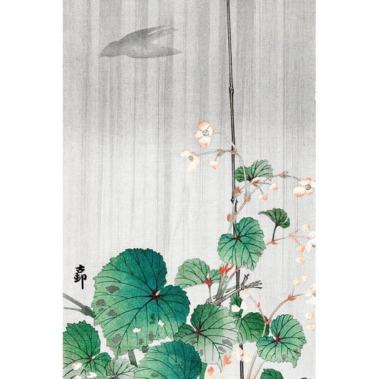 Begonia in the rain Black Modern Wood Framed Art Print by Koson, Ohara