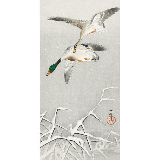 Two wild ducks in flight Black Modern Wood Framed Art Print by Koson, Ohara