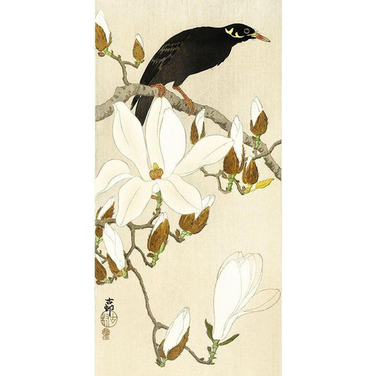 Myna on Magnolia Branch Black Modern Wood Framed Art Print by Koson, Ohara