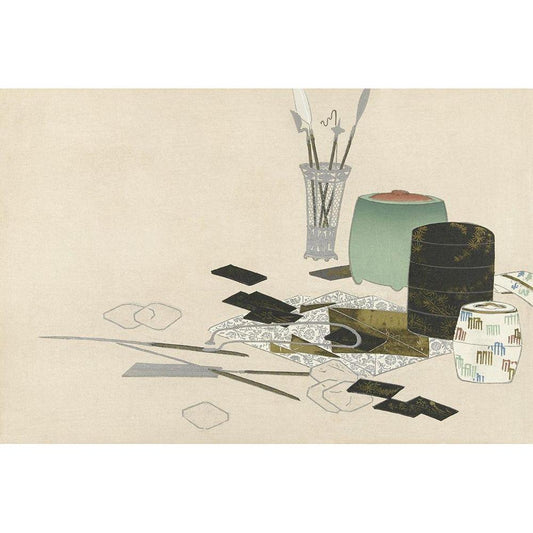 Art supplies from Momoyogusa Black Modern Wood Framed Art Print by Sekka, Kamisaka