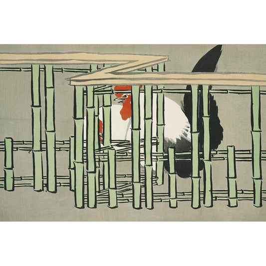 Roosters from Momoyogusa Black Modern Wood Framed Art Print by Sekka, Kamisaka