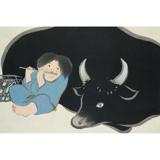 Flute player from Momoyogusa Black Modern Wood Framed Art Print by Sekka, Kamisaka