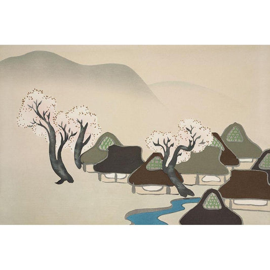 Village with cherry blossoms from Momoyogusa Black Modern Wood Framed Art Print by Sekka, Kamisaka