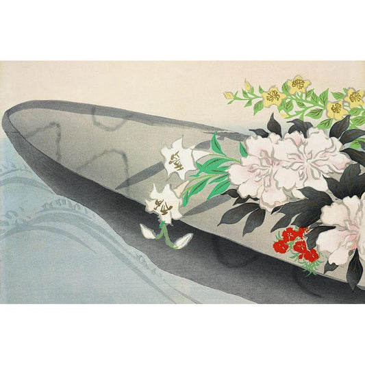 Flower boat from Momoyogusa Black Modern Wood Framed Art Print by Sekka, Kamisaka