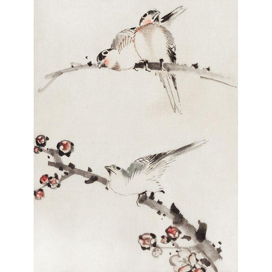 Three Birds Perched on Branches, One with Blossoms Black Modern Wood Framed Art Print by Hokusai, Katsushika