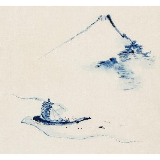 A Person in a Small Boat on a River with Mount Fuji in the Background Black Modern Wood Framed Art Print by Hokusai, Katsushika