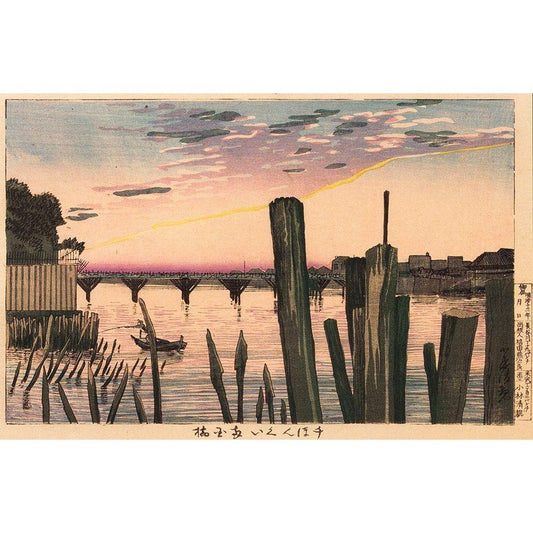 Breakwater Stakes and Ryogoku Bridge Black Modern Wood Framed Art Print by Kiyochika, Kobayashi
