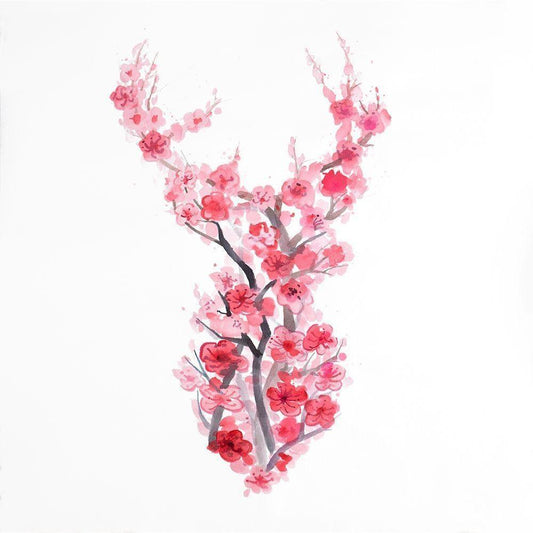 DEER WITH CHERRIES BLOSSOM Black Modern Wood Framed Art Print by Atelier B Art Studio