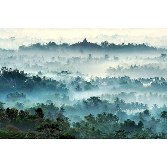 Misty Borobudur Black Modern Wood Framed Art Print by Ramdani
