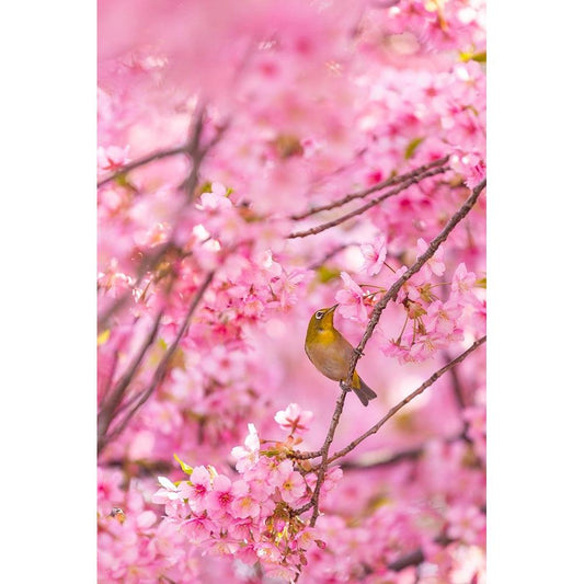 cherry blossoms and bird Black Modern Wood Framed Art Print by Chen, Liang