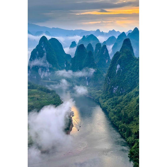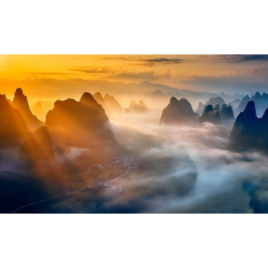 Yangshuo Sunrise Black Modern Wood Framed Art Print by Zhu, Hua