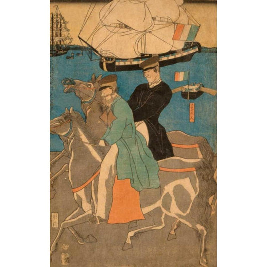 French men taking horse ride on Sunday in Yokohama (Yokohama kyujitsu Furansujin uma yuko), 1861 Black Modern Wood Framed Art Print by Utagawa, Sadahide