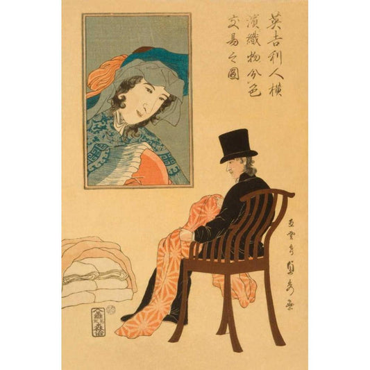 English man sorting fabrics for trade in Yokohama (Igirisujin Yokohama ni orimono irowake no zu), 18 Black Modern Wood Framed Art Print by Utagawa, Sadahide