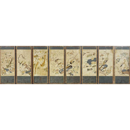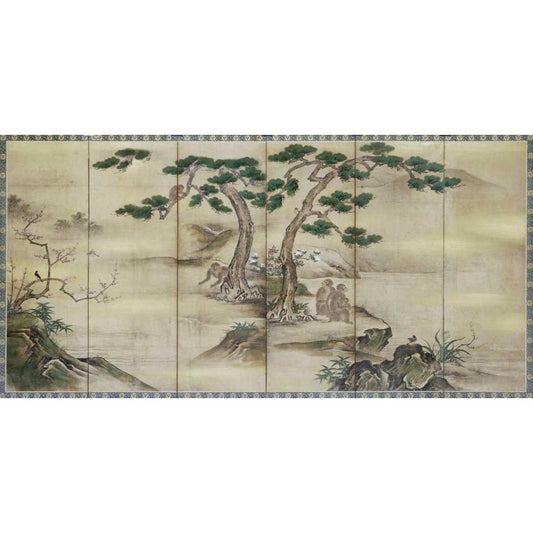 Birds, Flowers and Monkeys Six-Panel Screen Black Modern Wood Framed Art Print by Kano School
