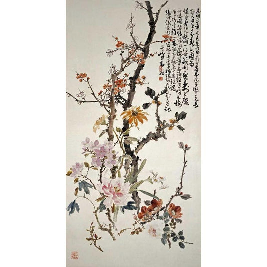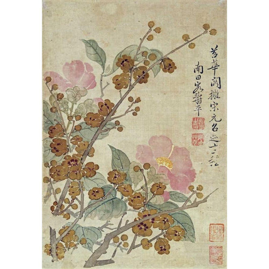 Plum Blossom and Camellias Black Modern Wood Framed Art Print by Shouping, Yun
