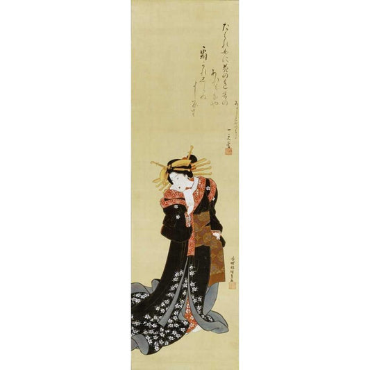 A Standing Courtesan In a Black Kimono Black Modern Wood Framed Art Print by Kunisada, Utagawa