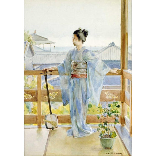 Geisha Standing On a Balcony Black Modern Wood Framed Art Print by Stern, Anton Alois