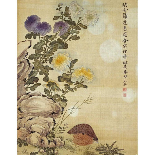 Chrysanthemums and Quail Black Modern Wood Framed Art Print by Yuanyu, Ma