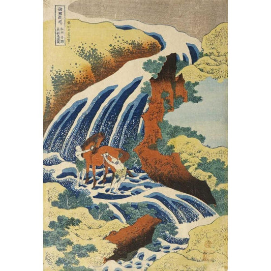 Two Men Washing a Horse in a Waterfall Black Modern Wood Framed Art Print by Hokusai