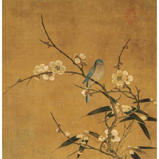 Blue Bird On a Plum Branch With Bamboo Black Modern Wood Framed Art Print by Unknown