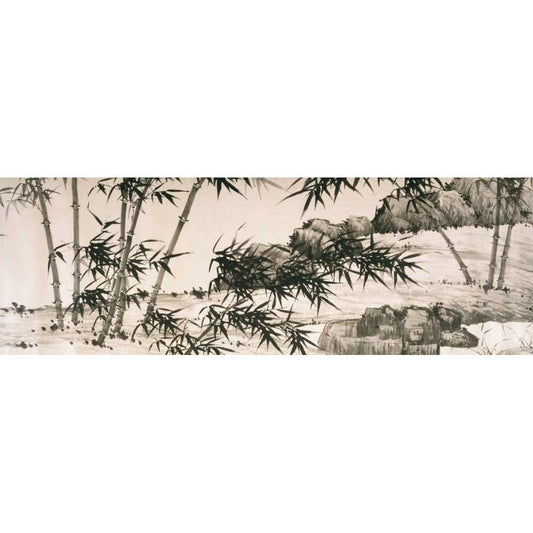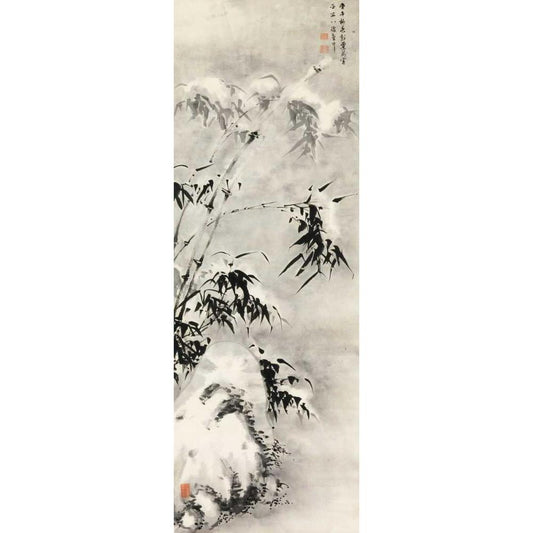 Bamboo and Rock in Snow Black Modern Wood Framed Art Print by Anonymous