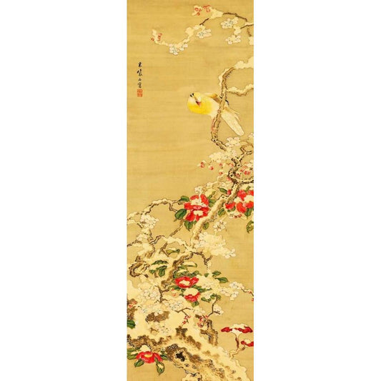 Bird among Camellias in Snow Black Modern Wood Framed Art Print by Anonymous