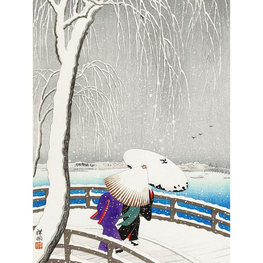 Two women in the snow on Yanagi Bridge Black Modern Wood Framed Art Print by Koson, Ohara