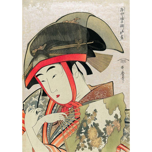 Woman holding a fan wearing a traditional transparent hat Black Modern Wood Framed Art Print by Kitagawa, Utamaro