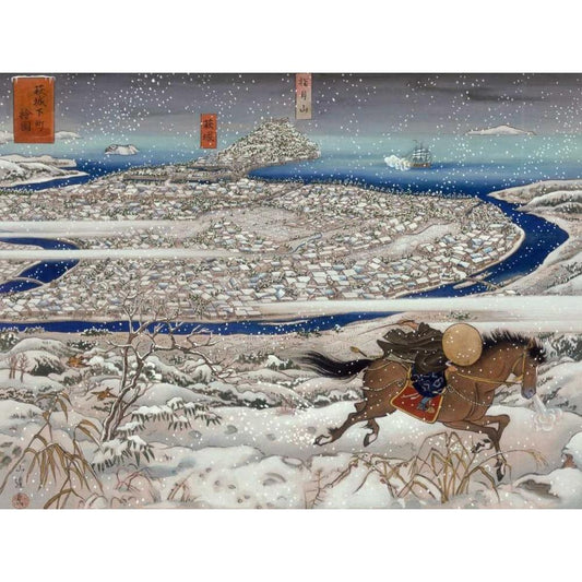 A horseman rides from the town Hagi 1865 Black Modern Wood Framed Art Print by Anonymous