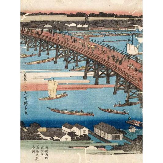 Drum bridge at Meguro and Sunset Hill Black Modern Wood Framed Art Print by Hiroshige, Ando