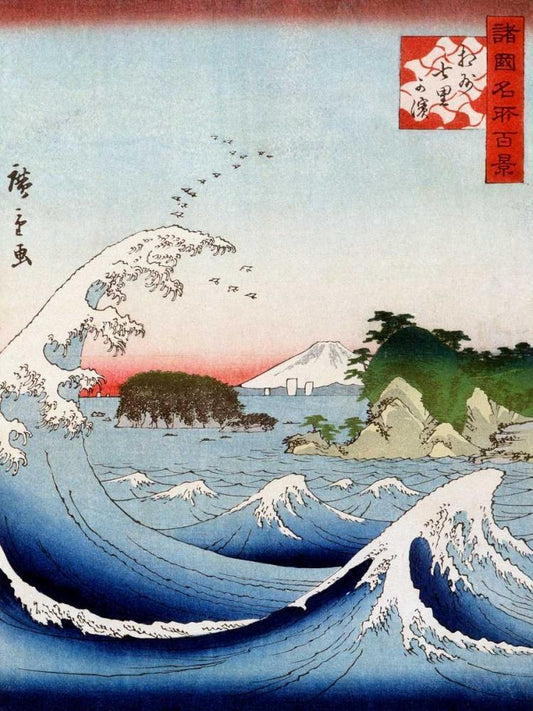 Mount Fuji seen through the waves at Manazato no hama White Modern Wood Framed Art Print with Double Matting by Ando, Hiroshige