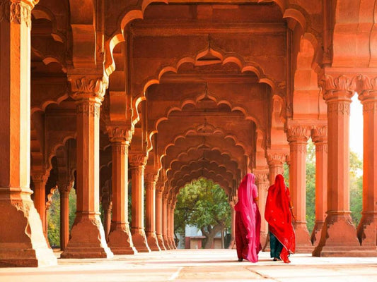 Woman in traditional Sari walking towards Taj Mahal White Modern Wood Framed Art Print with Double Matting by Pangea Images
