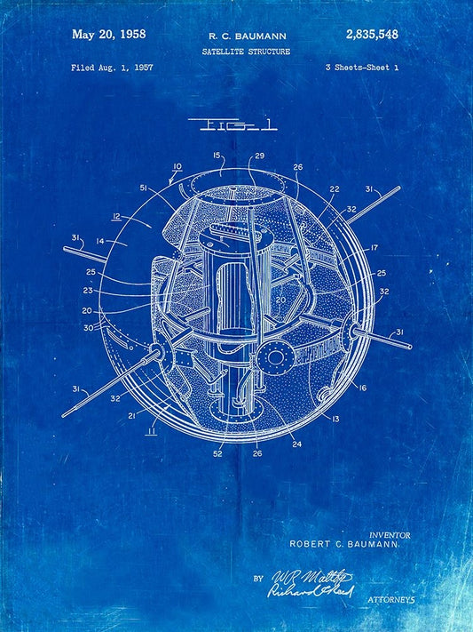 PP52-Faded Blueprint Earth Satellite Patent Poster White Modern Wood Framed Art Print with Double Matting by Borders, Cole