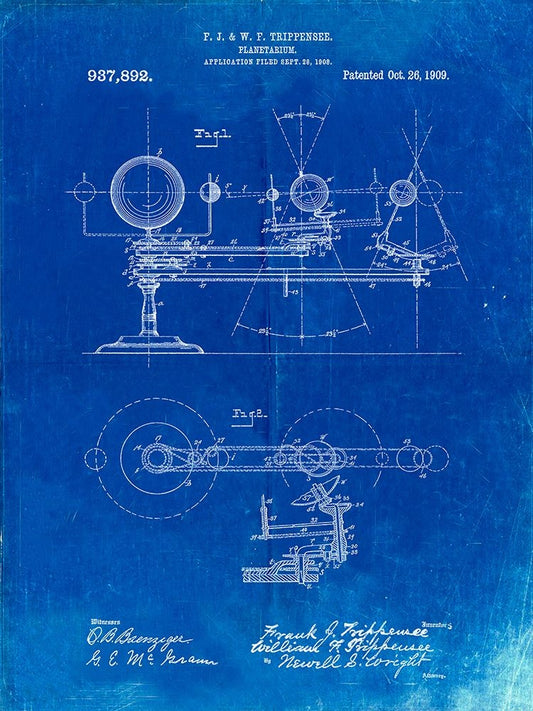 PP988-Faded Blueprint Planetarium 1909 Patent Poster White Modern Wood Framed Art Print with Double Matting by Borders, Cole