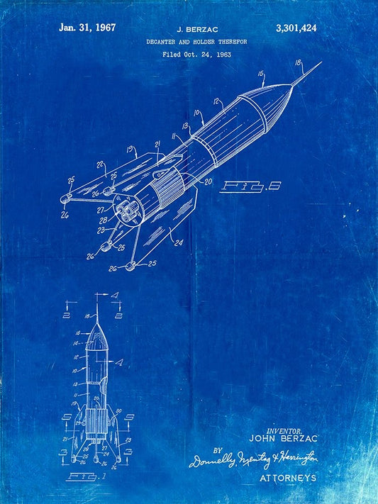 PP1017-Faded Blueprint Rocket Ship Model Patent Poster White Modern Wood Framed Art Print with Double Matting by Borders, Cole