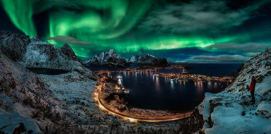 Lofoten Aurora Reflection Black Ornate Wood Framed Art Print with Double Matting by De La, Javier