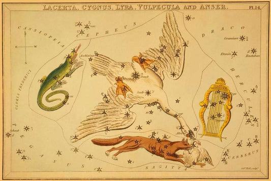 Lacerta, Cygnus, Lyra, Vulpecula and Anser, 1825 Black Ornate Wood Framed Art Print with Double Matting by Aspin, Jehoshaphat