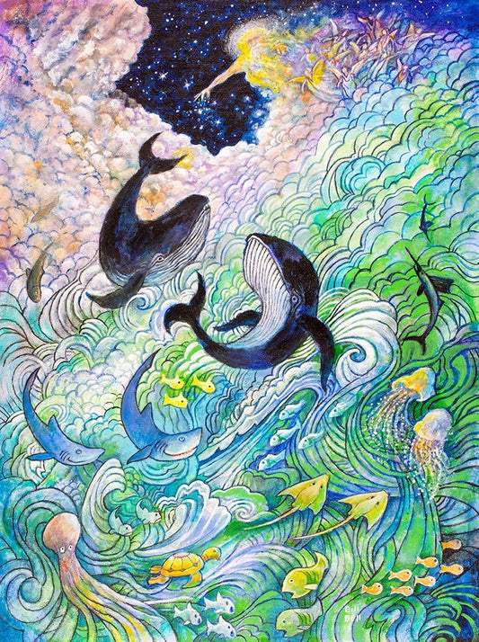 Creation Whales and Fishes Black Ornate Wood Framed Art Print with Double Matting by Bell, Bill