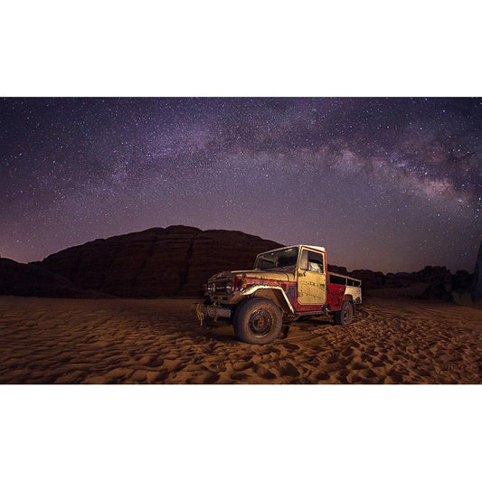 Car Under The Milkyway Galaxy White Modern Wood Framed Art Print by Shawki Ibrahim, Saad