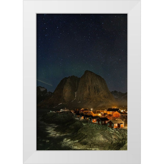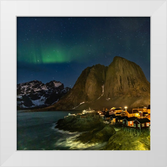 Norway- Lofoten Islands. Aurora Borealis In the sky above Hamnoy in Reine White Modern Wood Framed Art Print by Looney, Hollice