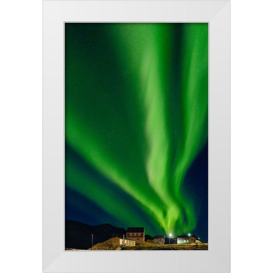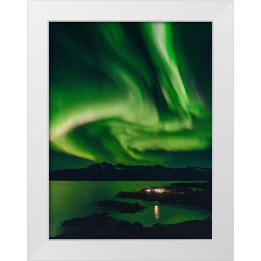 Northern Lights over settlement Kuummiit. Ammassalik area in East Greenland- Danish Territory White Modern Wood Framed Art Print by Zwick, Martin